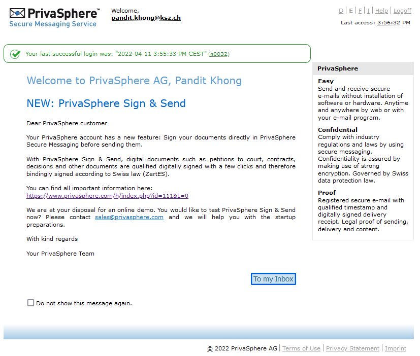 - Den Welcome Text lesen und auf «To my Inbox» klicken