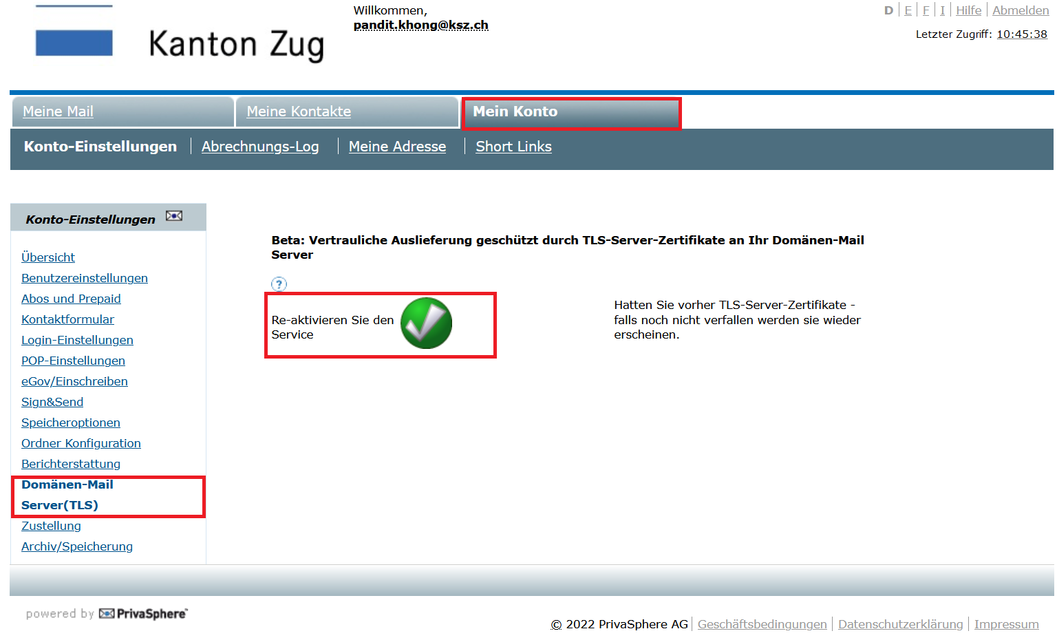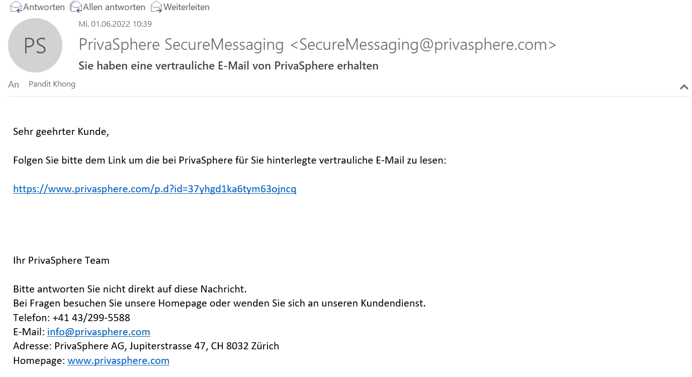 - Über eine Benachrichtigung «Sie haben eine Vertrauliche E-Mail von PrivaSphere erhalten».