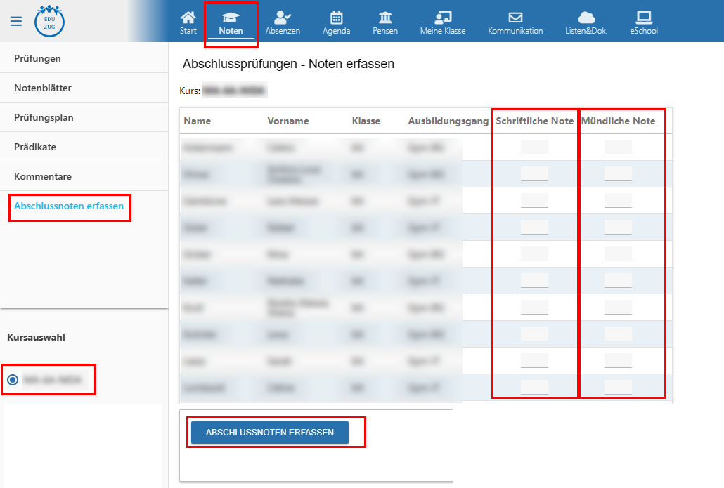 Die Erfassung der schriftlichen und der mündlichen Prüfungsnoten erfolgt unmittelbar nach Abschluss der mündlichen Prüfung durch die Lehrpersonen in schulNetz: Modul "Noten", "Abschlussnoten erfassen". Unten links den gewünschten Kurs auswählen.