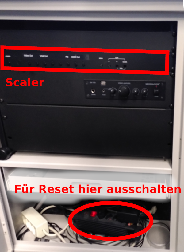 - Gerät wird nicht erkannt. Das kann daran liegen, dass vorgängig ein anderer Gerätetyp angschlossen war und der Scaler (Gerät, welches die Daten vom Endgerät auf den Beamer schickt) die alten Einstellungen beibehält. Am ehesten nützt ein Reset des Scalers: Den Strom an der Stromschiene für 15 Sekunden abstellen und danach wieder einschalten (siehe Abbildung). Hingegen reicht es es oft nicht, den Scaler einfach nur auszuschalten, da dies den Gerätespeicher nicht leert.
