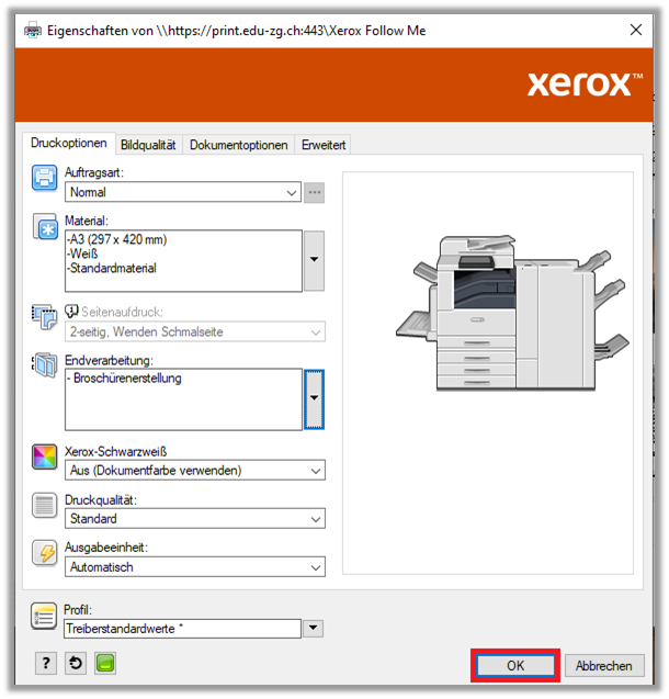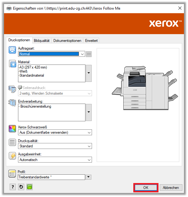 Drucker «Xerox Follow Me» auswählen und auf «Eigenschaft» klicken - Folgende Einstellungen vornehmen: