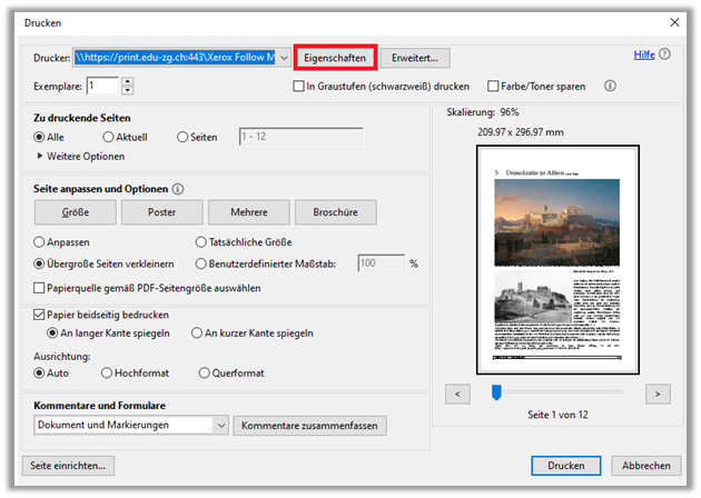 - Dokument öffnen, > «Datei», > «Drucken», Drucker «Xerox Follow Me» auswählen und auf «Druckereigenschaften» klicken