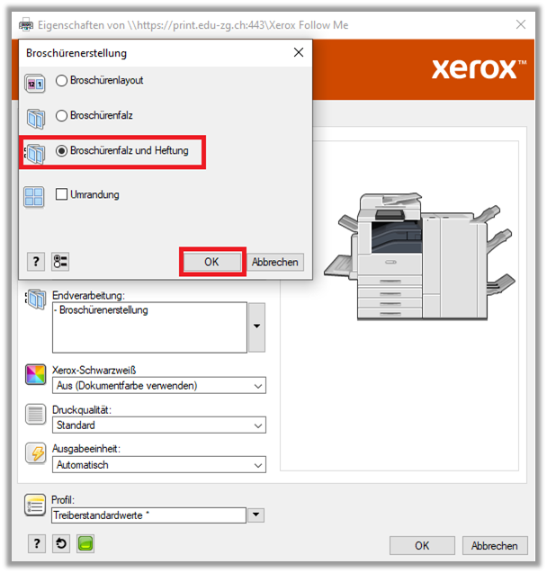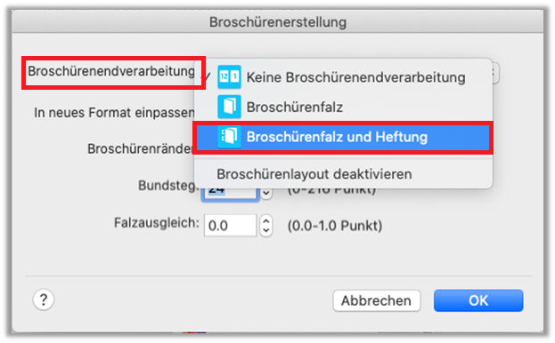 - Broschürenerstellung: «Broschürenfalz und Heftung» wählen und «Umrandung» auswählen. Dann auf «OK» klicken