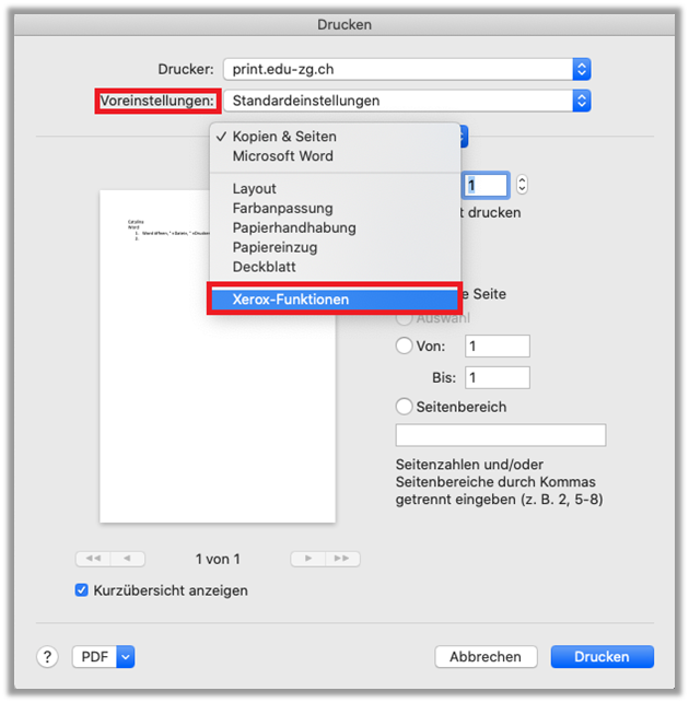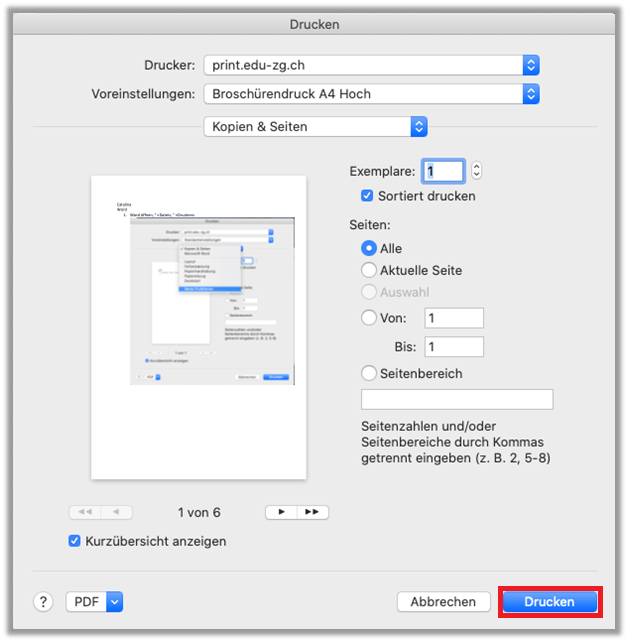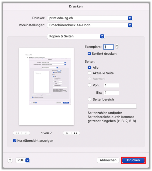 - PDF-Dokument mit «Vorschau» öffnen, > «Ablage», > «Drucken»