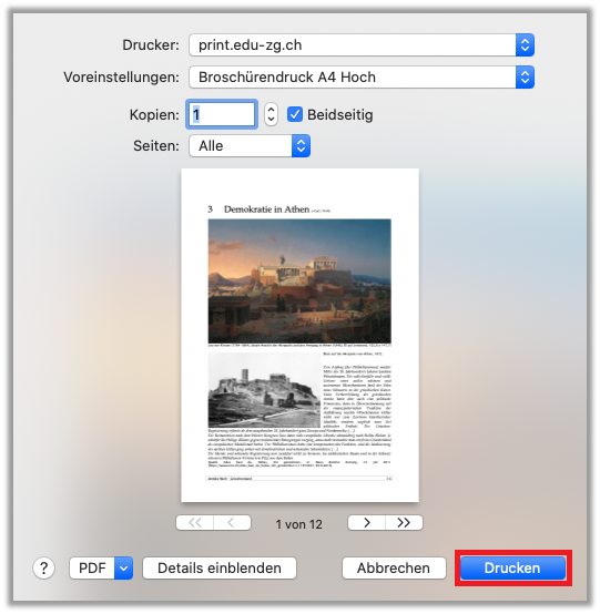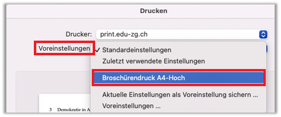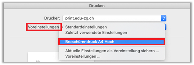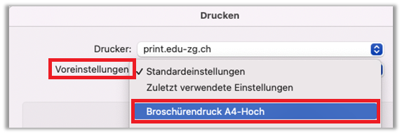 - Voreinstellung: «Broschürendruck A4 Hoch» wählen - Auf «Drucken» klicken