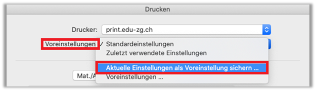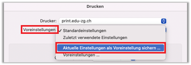 - Voreinstellungen: «Aktuelle Einstellungen als Voreinstellung sichern...» wählen