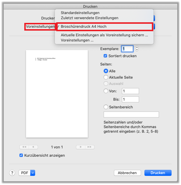 - Voreinstellung: «Broschürendruck-A4 Hoch» wählen