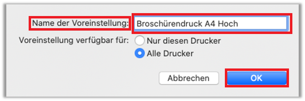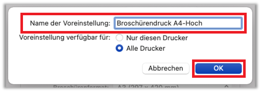 - Name der Voreinstellung: «Broschürendruck A4-Hoch» oder ähnliches benennen und auf «OK» klicken - Voreinstellung ist nun gespeichert. «Drucken-Fenster» kann mit «Abbrechen» beendet werden