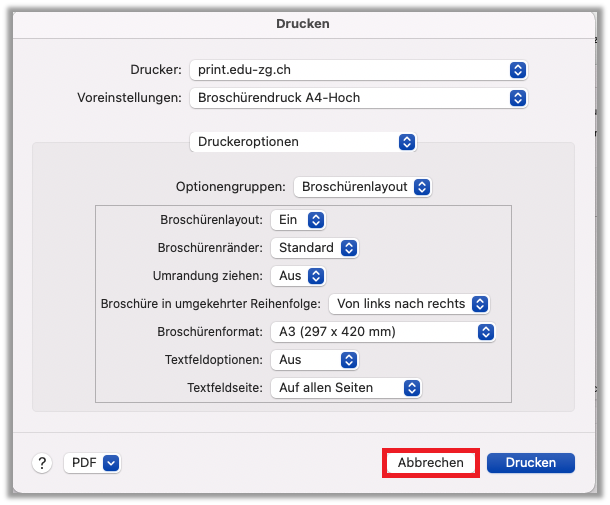 - Voreinstellung ist nun gespeichert. «Drucken-Fenster» kann mit «Abbrechen» beendet werden