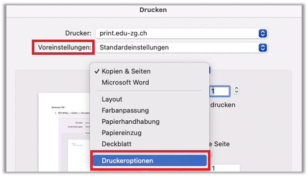- Voreinstellung: «Druckeroptionen» wählen