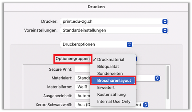 - Optionengruppe: «Druckmaterial» wählen, nach unten scrollen