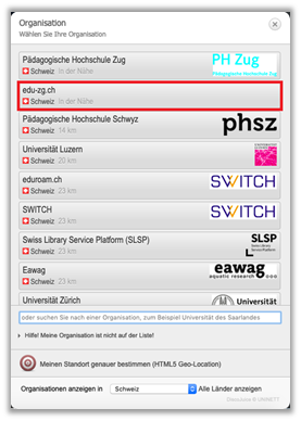 Wählen Sie „edu-zg.ch“ als Organisation aus.