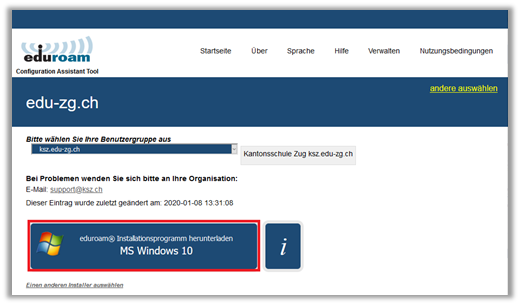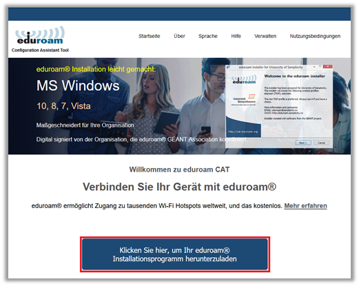 Klicken Sie auf „Klicken Sie hier, um Ihr eduroam Installationsprogramm herunterzuladen“