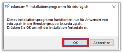 Geben Sie nun ihren Login-Daten (username@ksz.edu-zg.ch) und das eduroam Passwort aus dem «SchulNetz» ein, danach auf „OK“