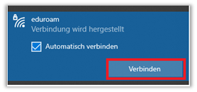Achtung: Bei einigen Windows Versionen erscheint gleich das nächstes Bild. Das „eduroam“ Netz kann somit angebunden werden.