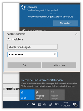 Geben Sie als Benutzername username@ksz.edu-zg.ch und als Passwort das oben bezogene eduroam Passwort aus dem «SchulNetz» ein.
