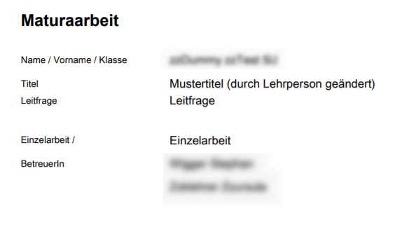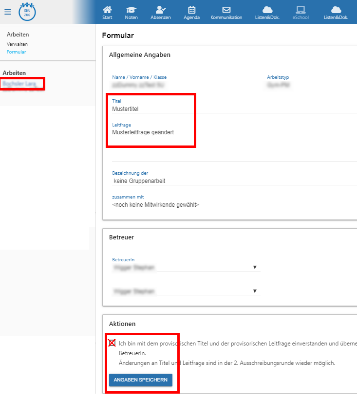 Es können noch Änderungen vorgenommen und wieder gespeichert werden, solange die Lehrperson die Übernahme der Arbeit mit den aufgeführten Angaben noch nicht bestätigt hat (vgl. Schritt 2).
