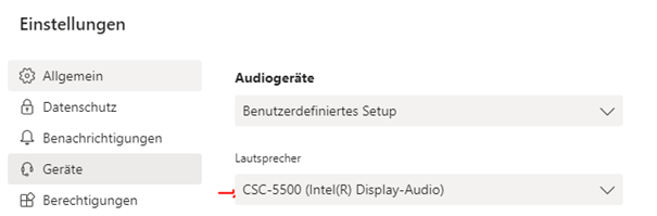 - Falls der Ton der Quarantäne-Schülerin bzw. des Quarantäne-Schülers nicht auf das Jabra, sondern direkt ins Unterrichtszimmer mittels Zimmerlautsprecher geschaltet werden soll, kann die untenstehende Einstellung (oder evtl. eine andere, je nach Gerät) eingestellt werden, sofern der Laptop über das HDMI-Kabel mit der Audio-Anlage des Zimmers verbunden ist (als Mikrofon muss das Jabra eingestellt bleiben). Das hätte den Vorteil, dass die Klasse hört, was die Schülerin bzw. der Schüler zum Unterricht beiträgt.