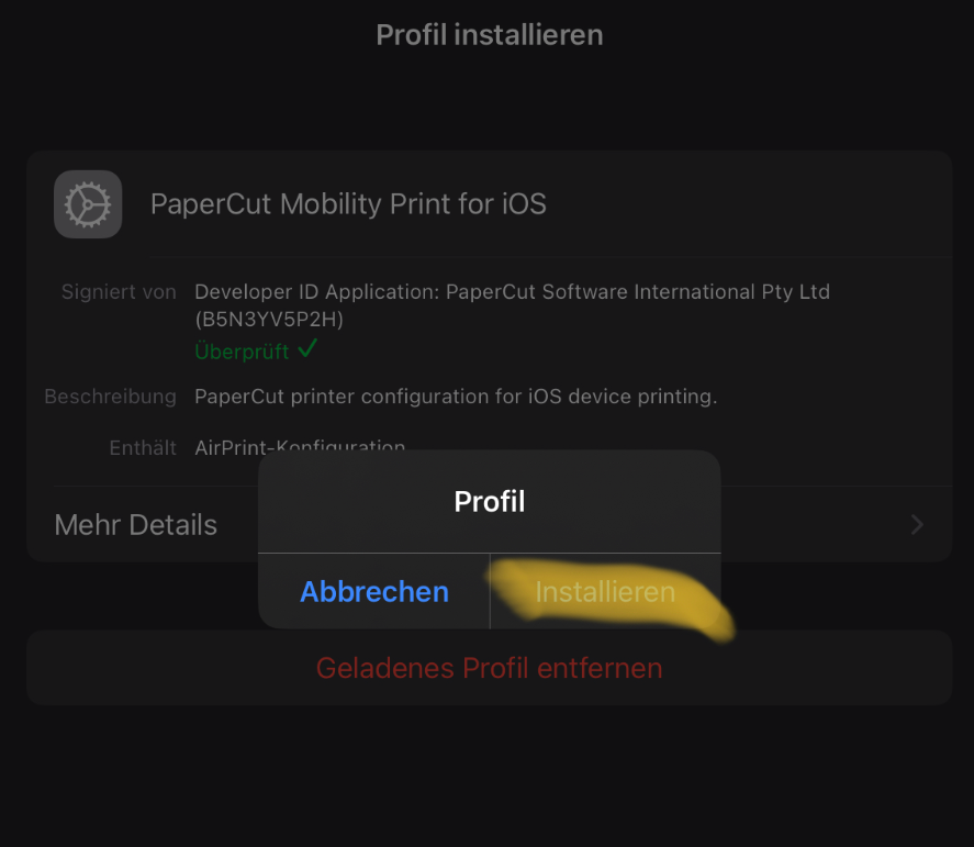 Falls dies nicht funktioniert, folgenden Link probieren und auf Download drücken: https://webprint.edu-zg.ch:9164/client-setup/known-host/ios.html - Profil zulassen