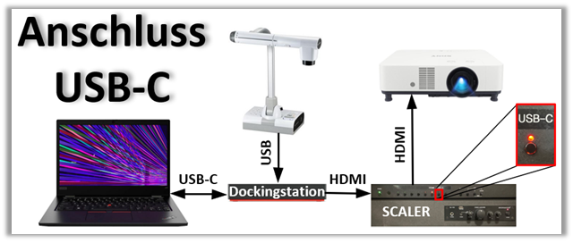 - Notebook-Signal wird via die Dockingstation und Scaler auf den Beamer übertragen