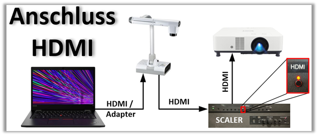 - «Scaler» und «Audioverstärker» einschalten, anschliessen die Quelle «HDMI» auswählen