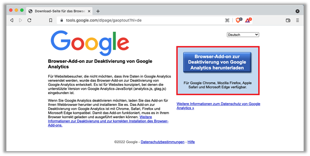 https://tools.google.com/dlpage/gaoptout?hl=de (Stand 22.01.22) - Klicken Sie nun auf dem grossen blauen Buttom mit der Aufschrift