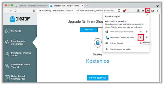 - «Ghosteryr» wurde nun hinzugefügt. Wenn gewünscht, kann «Ghostery» durch «Anpinnen» sichtbar gemacht werden.