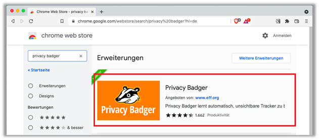 https://chrome.google.com/webstore/search/privacy%20badger?hl=de (Stand 22.01.22) - Klicken Sie bitte auf den eingekreisten Bereich «Privacy Badger»