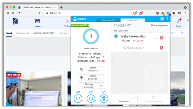 - Hier sehen wir, was «Ghostery» bei «20min.ch» zusätzlich blockiert