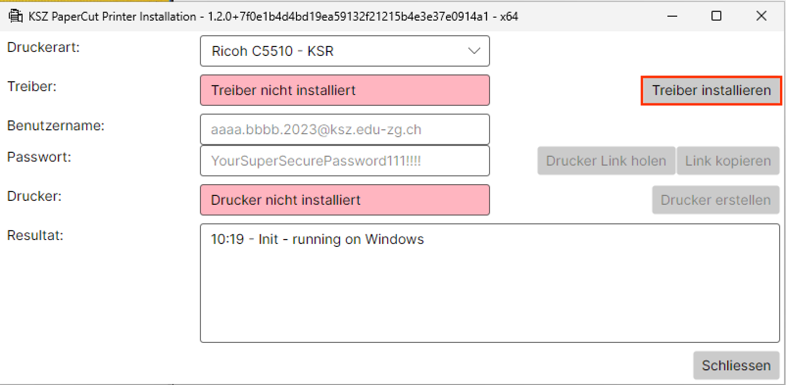 Ansonsten kontrolliere den Benutzername und das Passwort und drucke erneut auf "Drucker Link holen"