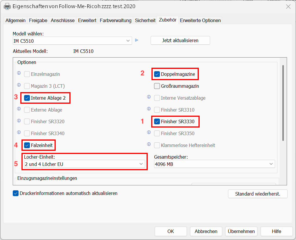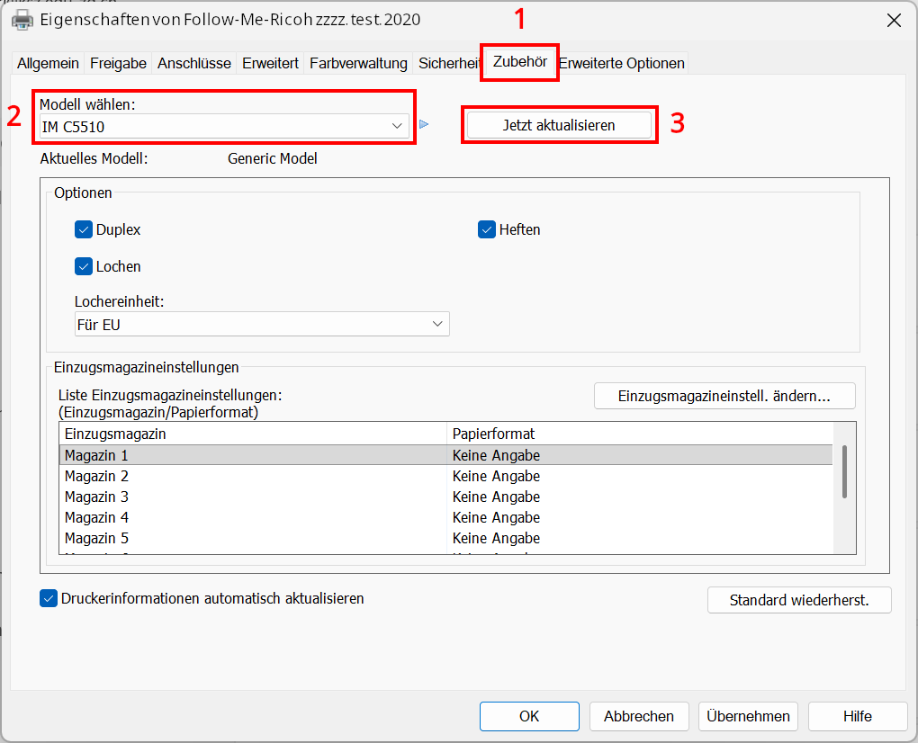 2. Klicke nun der Nummerierung nach wie im Bild dargestellt. Zuerst auf "1 - Zubehör", dann auf "2" und wähle "IM C5510" aus. Bestätige die Auswahl mit "3 - Jetzt aktualisieren"