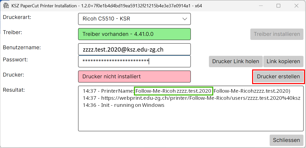 Wenn im Feld "Resultat" die Meldung "Follow-Me-Ricoh nach.vorn.20xx" erscheint, dann auf „Drucker erstellen“ klicken.