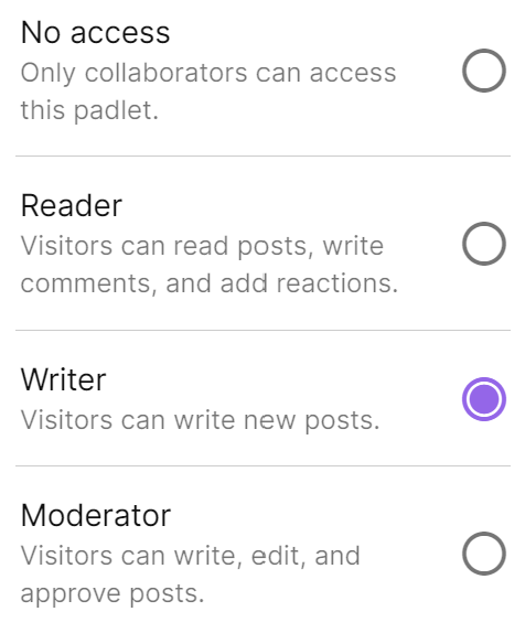 Bevor man ein padlet mit Schüler:innen teilt, muss man angeben, welche Rolle die Schüler:innen dabei einnehmen sollen. Für den Unterricht relevant sind hierbei v.a. die Einstellung "Reader" und "Writer". "Moderator" könnte allenfalls nützlich sein, wenn man den Schüler:innen die Möglichkeit geben möchte, Posts von anderen Schüler:innen zu korrigieren und/oder als richtig zu markieren (z.B. bei Prüfungsvorbereitung).