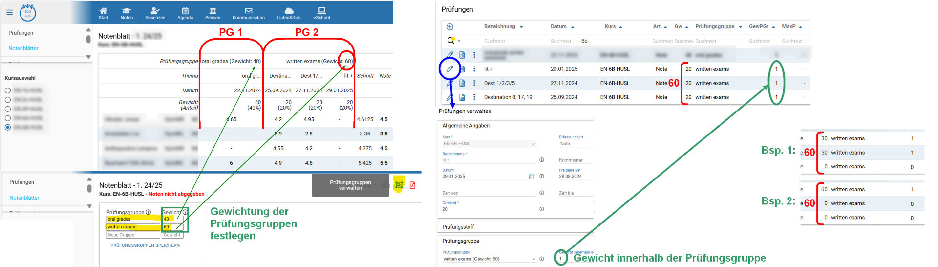- Beim Notenblatt kann die Gewichtung der Prüfungsgruppen erfasst werden (Abbildung links).