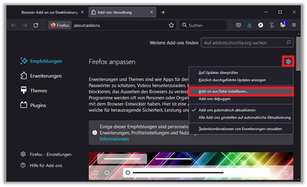 - Nun klicken Sie auf das «Zahnrad-Symbol» und auf «Add-on aus Datei installieren…»