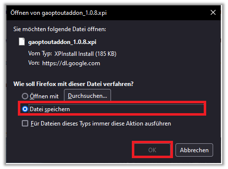 - Wählen Sie nun das soeben heruntergeladene Datei «gaoptoutaddon_1.0.8.xpi» aus und klicken Sie anschliessend auf «öffnen»
