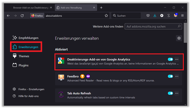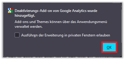 Es ist Ihnen überlassen, ob Sie «Google Analytics» auch in privaten Fenstern erlauben. - Da wir aus «Firefox-Addons» Fenster die Installation durchgeführt haben, klicken Sie bitte auf «Erweiterungen», danach ist das aktivierte «Deaktivierungs-Add-on von Google Analytics» sichtbar.