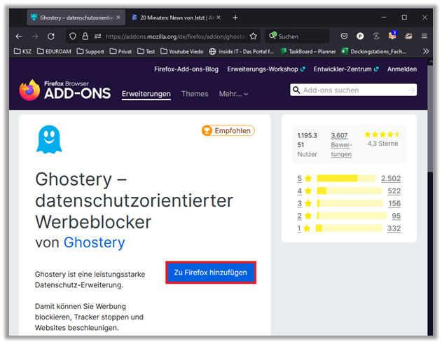 https://addons.mozilla.org/de/firefox/addon/ghostery/ (Stand 22.01.22) - Klicken Sie nun auf «Zu Firefox hinzufügen»