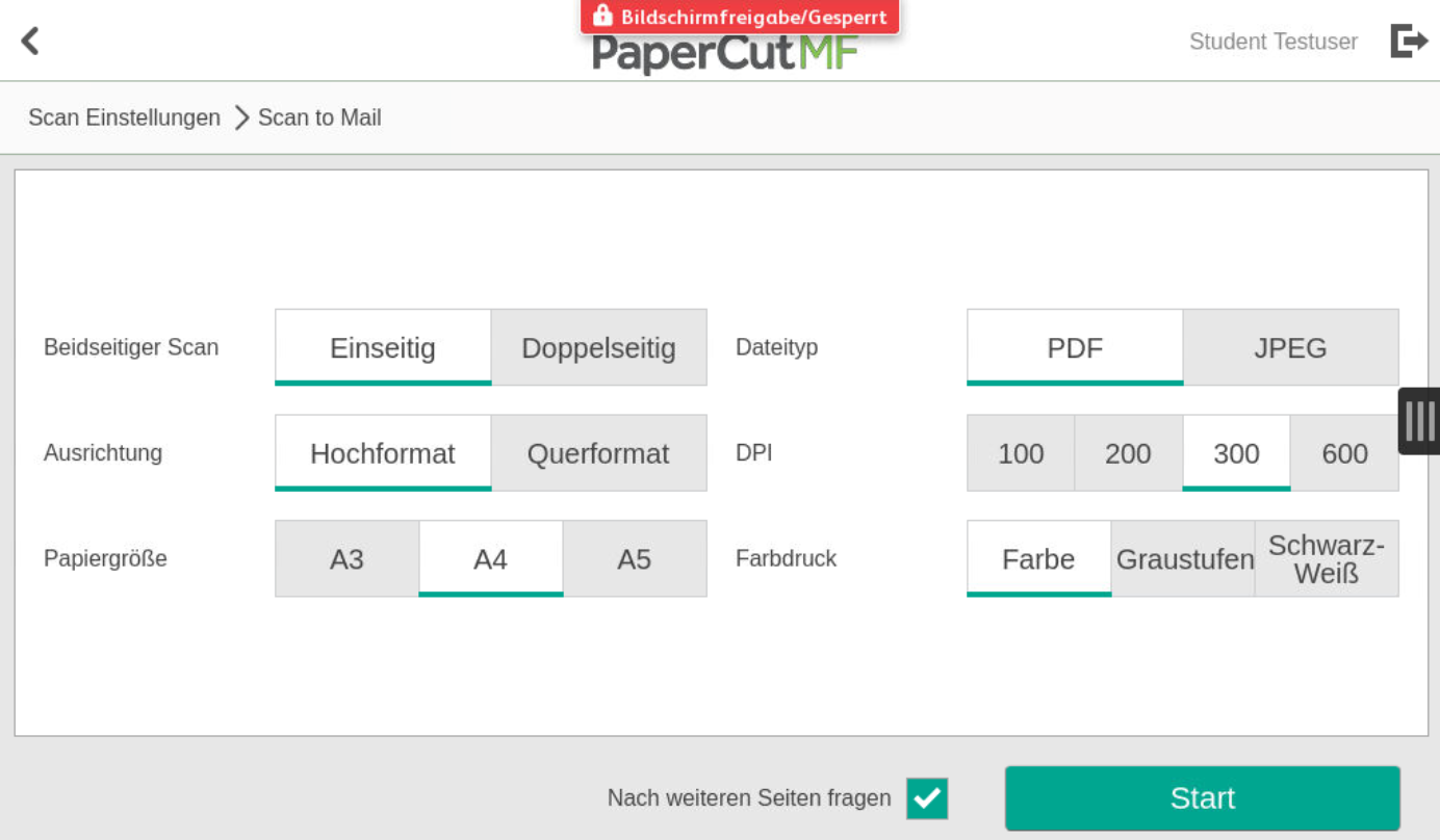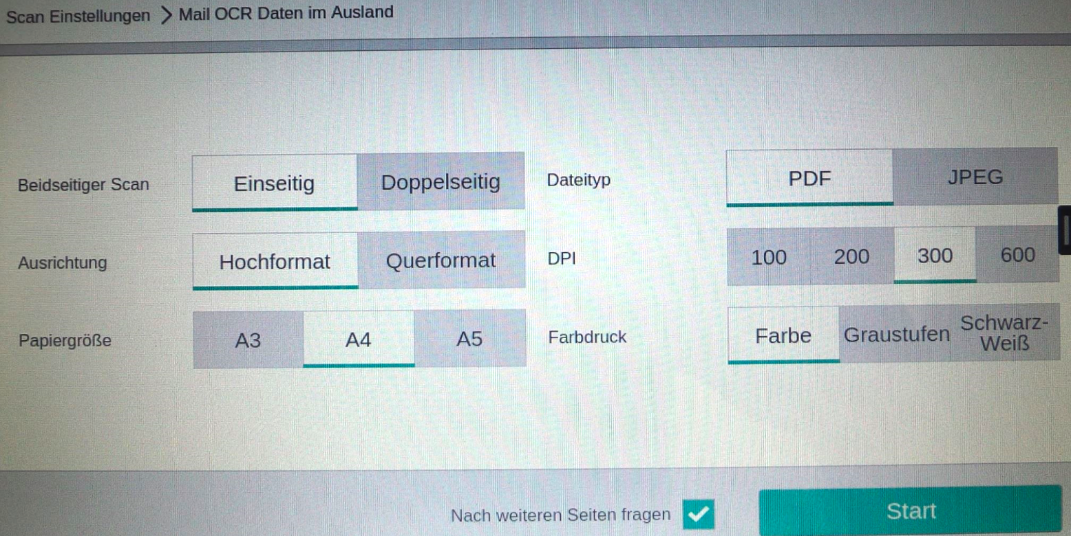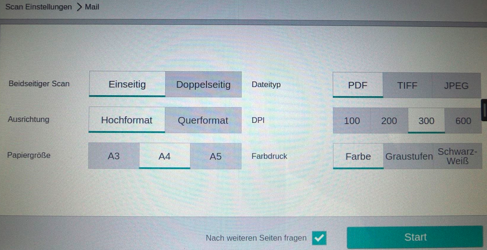 Sowohl beim "Scan to Mail" als auch beim "Scan to OneDrive" können Sie vor dem "Senden/Start" weitere Einstellungen vornehmen.