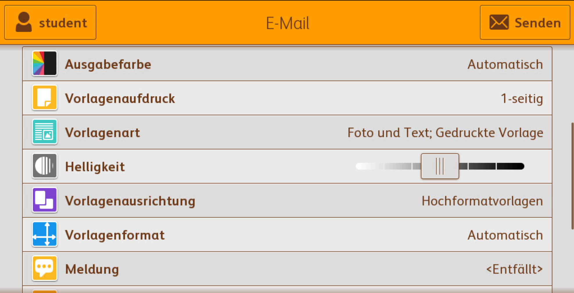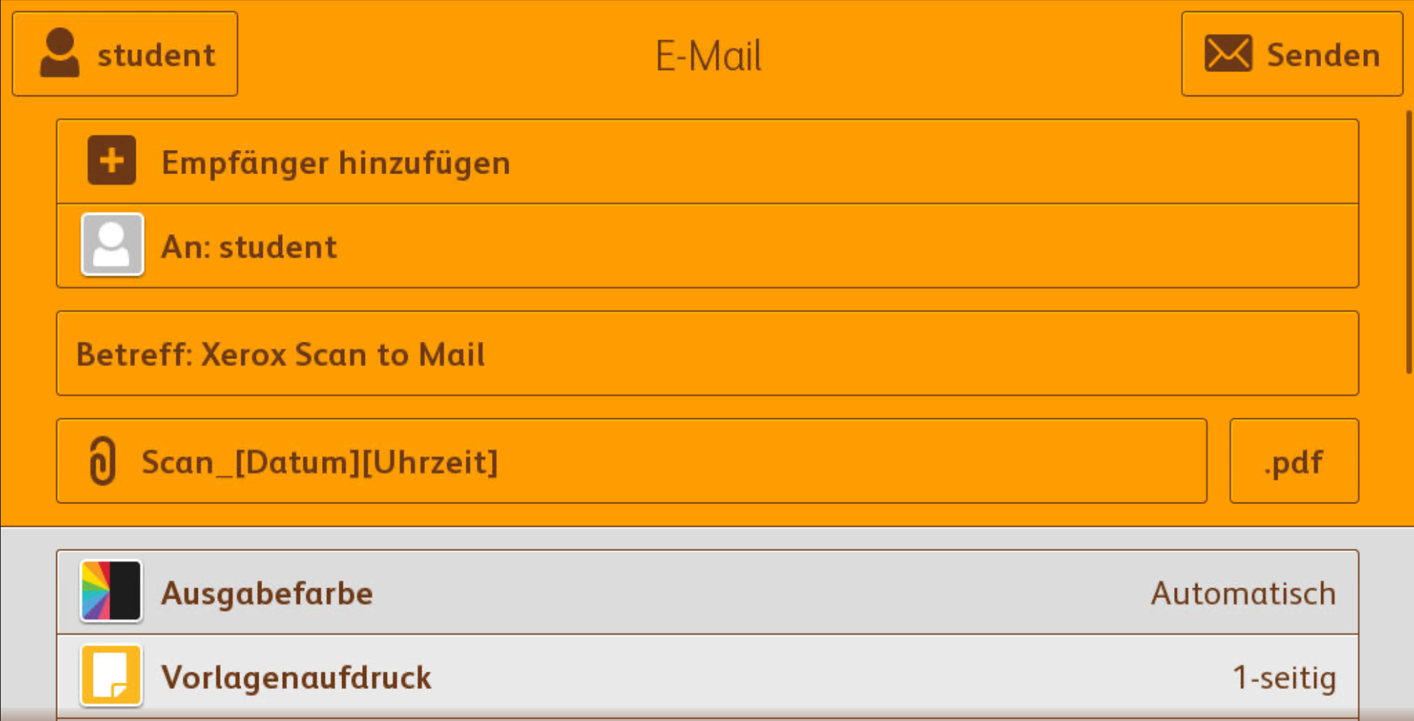 Wenn Sie scannen wollen und das Icon "E-Mail" gewählt haben, kommen Sie auf diesen Bildschirm: