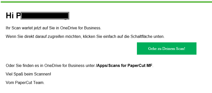Eine JPG-Datei ohne OCR oder eine PDF-Datei mit OCR wird, jenach Einstellung, erstellt und an die eigene OneDrive-Ordner gesendet. Standardmässig wird eine PDF-Datei erstellt und nach E-Mail-Bestätigung auf "..\OneDrive - EDU ZG\Apps\Scans for PaperCut MF" abgelegt.