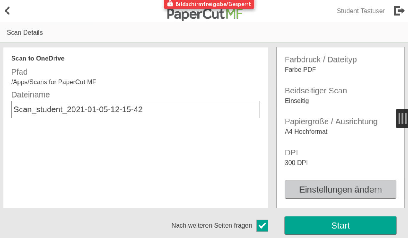 Hier können Sie die "Dateiname" anpassen und mit "Start" den Scan direkt an Ihre OneDrive-Speicher senden.