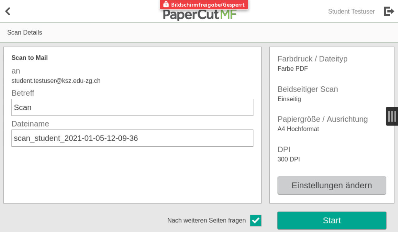 Hier können Sie den "Betreff" und die "Dateiname" anpassen und mit "Start" den Scan direkt an Ihre E-Mail Adresse senden.