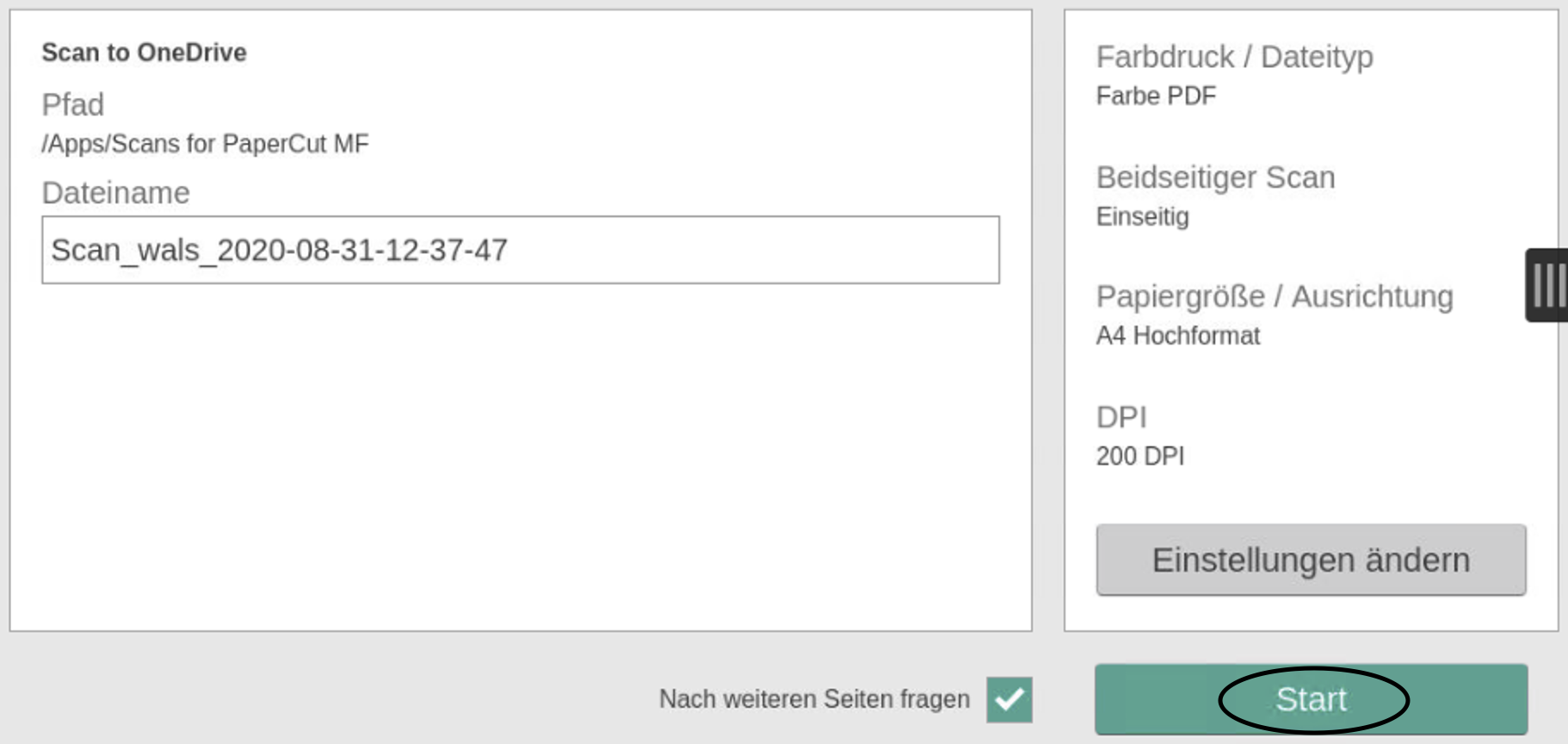 Eine JPG-Datei ohne OCR oder eine PDF-Datei mit OCR wird, jenach Einstellung, erstellt und an die eigene OneDrive-Ordner gesendet. Standardmässig wird eine PDF-Datei erstellt und nach E-Mail-Bestätigung auf "..\OneDrive - EDU ZG\Apps\Scans for PaperCut MF" abgelegt.
